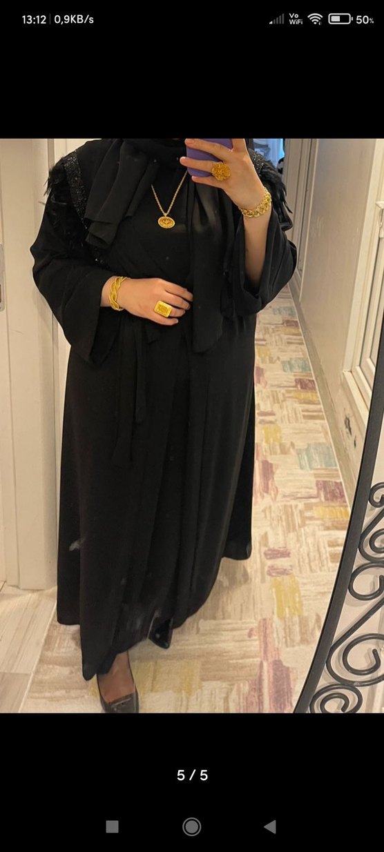 Siyah uzun kollu abaya 1kez giyildi. sadece abaya içinin elbisesi yok. ölçüler iki kol arası 58cm, boy 130cm, kol boyu 53cm.