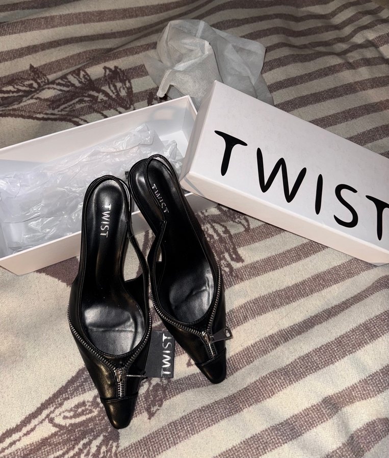 TWIS markalı, siyah fermuar desenli, tokalı stiletto topuklu ayakkabılar, şık sokak stiline uygun. Etiketi üzerinde hiç giyilmedi.