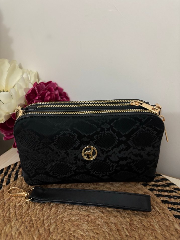 Siyah renkte yılan desenli, fermuarlı bölmeleri olan Cüzdan çanta / portföy omuz askısıda vardır