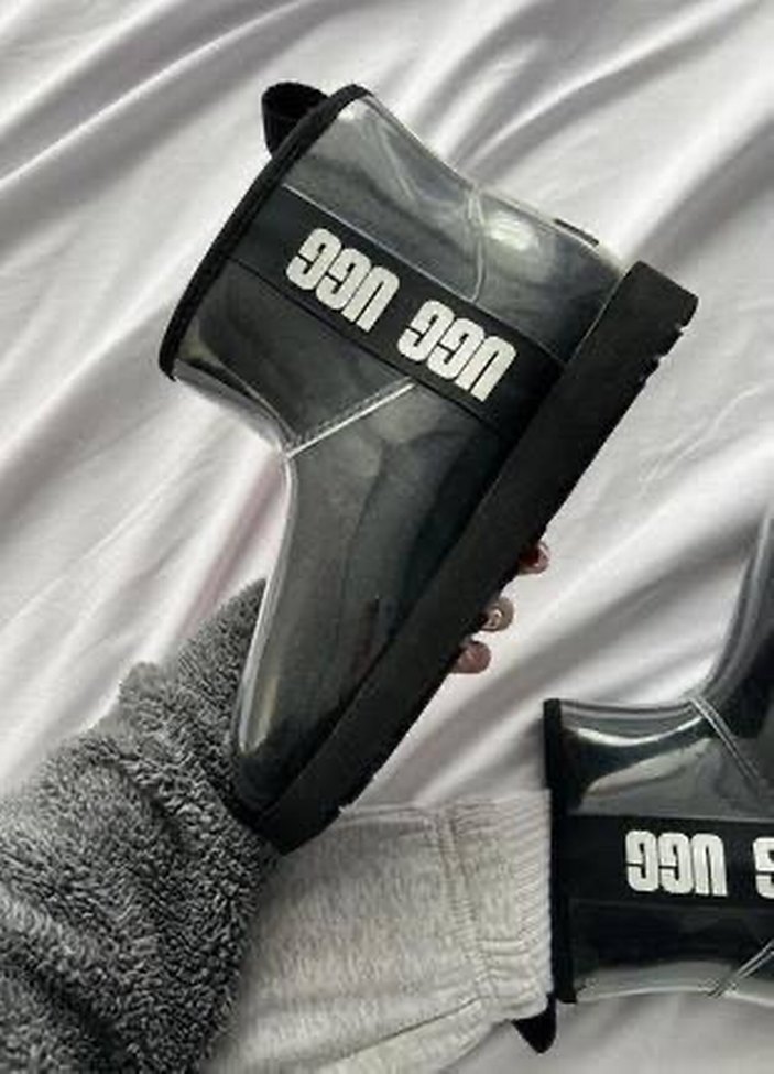 UGG Classic Clear Mini Renk: Siyah (transparan parlak yüzey) Kendi Kutusunda Dış Materyal: Suya dayanıklı şeffaf TPU (termoplastik poliüretan) kaplama İç Materyal: Yün astar (doğal koyun yünü karışımı, yumuşak ve sıcak tutar) Taban: Hafif, dayanıklı ve kaymaz EVA dış taban • Topuk Yüksekliği: 3 cm Su Geçirmezlik: Yağmurlu ve karlı havalarda koruma sağlar İç Kısım: Tam izolasyonlu; sıcak, konforlu, terletmeyen yapı Ağırlık: Hafif taban teknolojisi sayesinde uzun süreli kullanımda rahatlık sağlar (Duru)