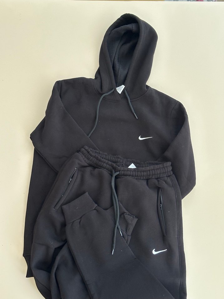 Siyah renkli, bol kesim Unisex eşofman takımı; kapüşonlu sweatshirt ve rahat pantolondan oluşur. Yumuşak kumaşıyla rahat ve şık bir görünüm sunar.