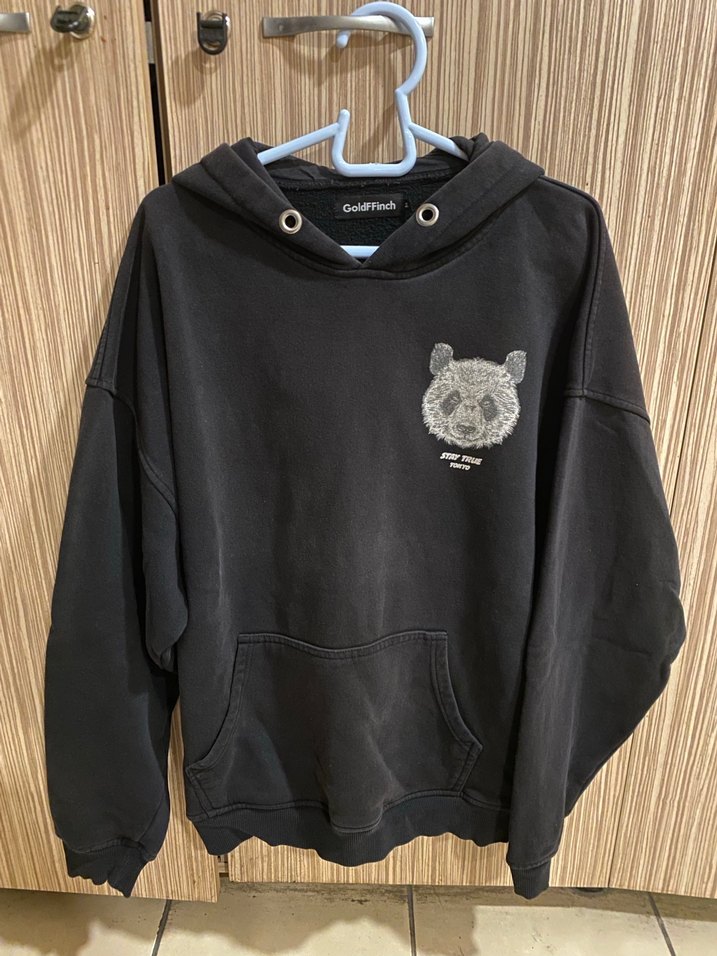 Siyah, bol kesim ve uzun kollu unisex kapüşonlu sweatshirt, göğüste tüylü panda baskısı ve ön cep içerir. Rahat ve günlük kullanım için uygundur.