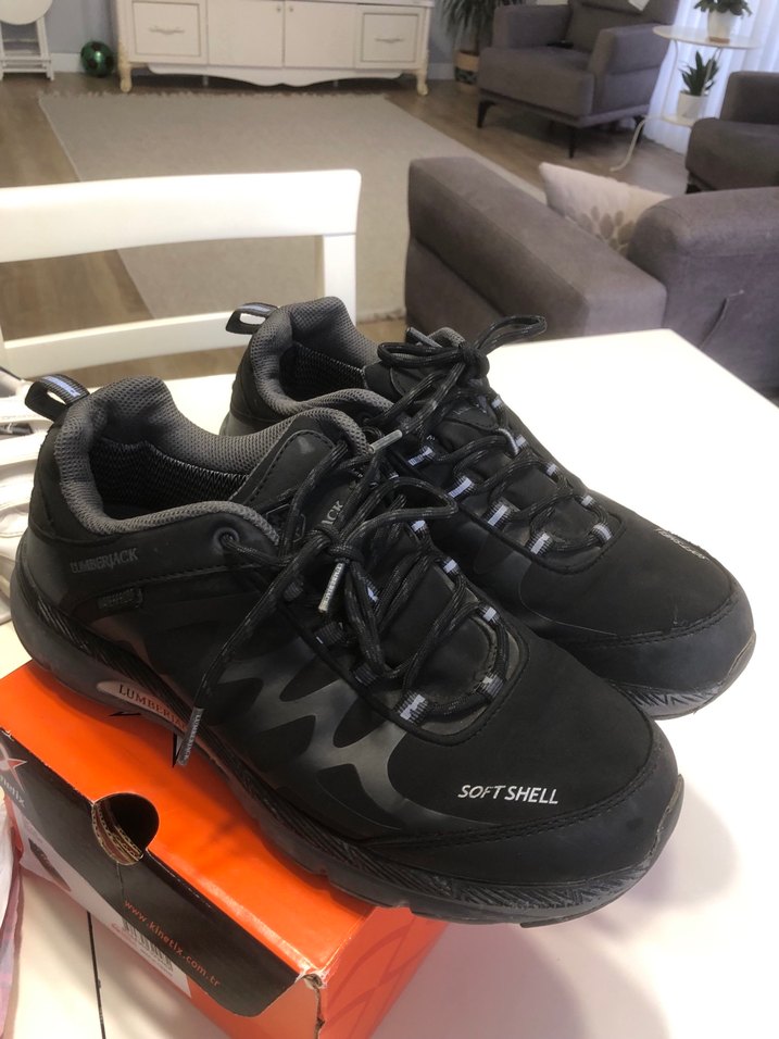 Siyah unisex spor outdoor ayakkabı, baskılı detaylı, kauçuk tabanlı ve Velcro bantlı. Rahat softshell üst yüzey ve streetwear tarzı sunar.