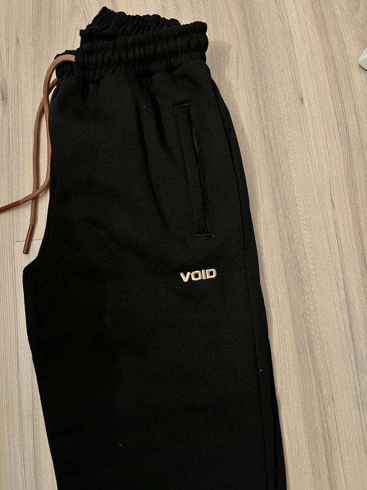 Siyah renkte, süet dokulu, Unisex özel jogger eşofman altı. Velcro detaylı, bol kesim ve 'VOID' yazılıdır. Günlük kullanıma uygundur.