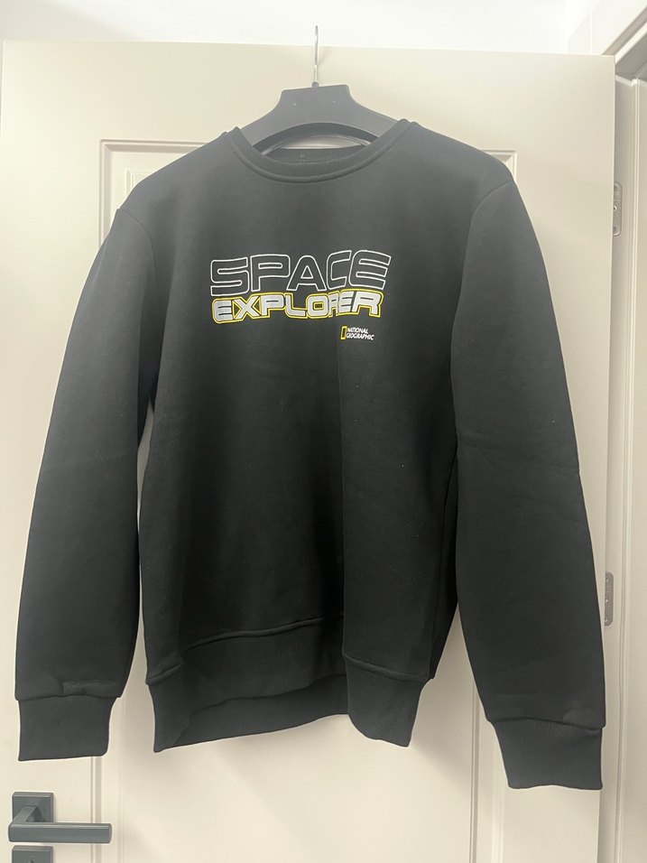 Siyah renkli, yuvarlak yakalı ve uzun kollu kadın sweatshirtü. 'SPACE EXPLORER' baskılı, yumuşak ve sıcak kumaştan, bol kesim bir iki sefer giyildi