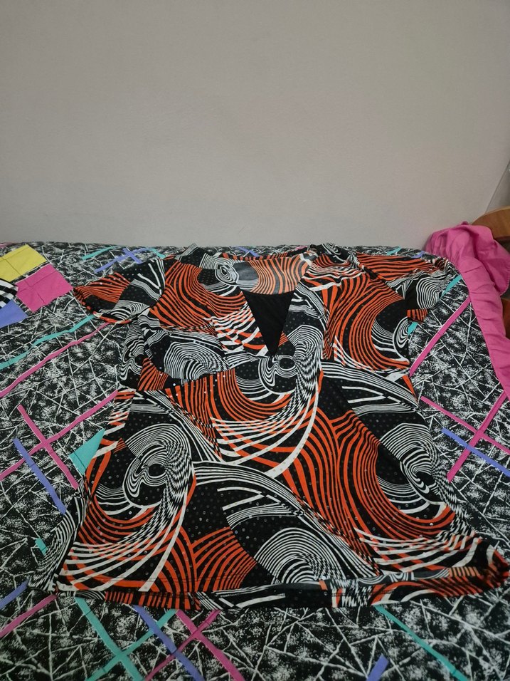 Desenli, çok renkli, uzun ve drapeli bluz. Kısa kollu ve V yakalı, şık ve avangart tarzda günlük kullanım için uygundur.