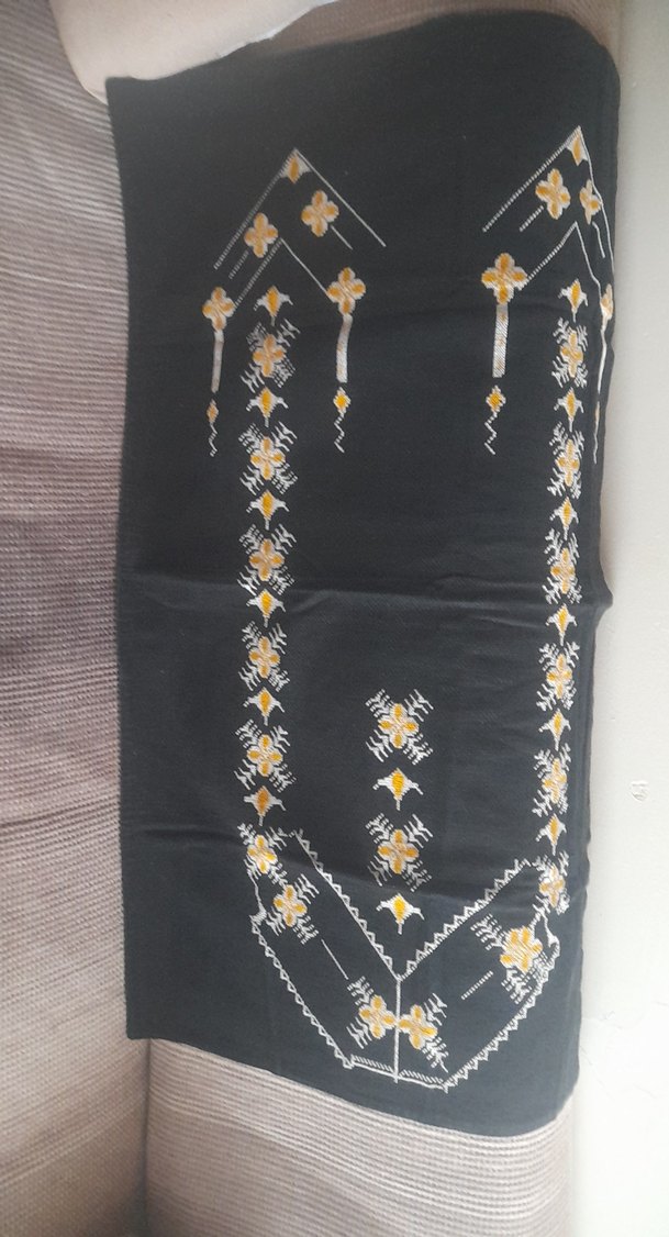 Siyah kumaş üzerinde sarı ve beyaz renklerde geleneksel nakış desenleri bulunan el işi ürünü.
