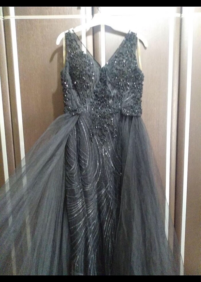 Rengi koyu siyah ışıktan farklı çıkmış uygulamadan aldım bedeni olmadığı için satıyorum. etiketinde 40 yazıyor fakat 36 38 bedene olur. Taşlı ağır bir abiye tül kuyruk fermuarlı çıkarılabilir