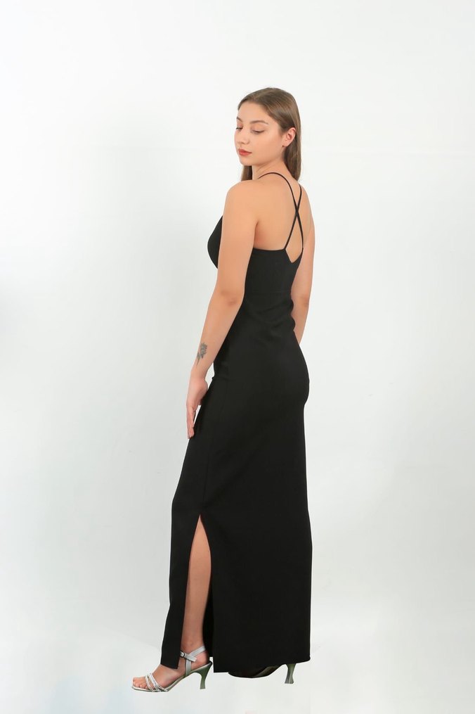 Siyah uzun elbise, V yakalı ve ince ip askılı tasarımı ve yırtmaç detayıyla şık ve sade bir görünüm sunar.