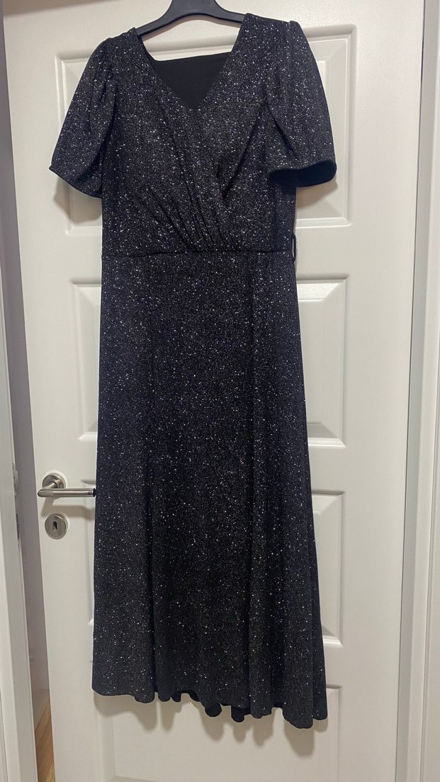 Siyah renkte, drapeli ve kısa kollu uzun abiye elbise. V yakalı, 1 kere giyildi hasarı yok. arkada çıtçıt var. isteyen olursa o çıtçıtı çıkartıp öyle de gönderebilirim