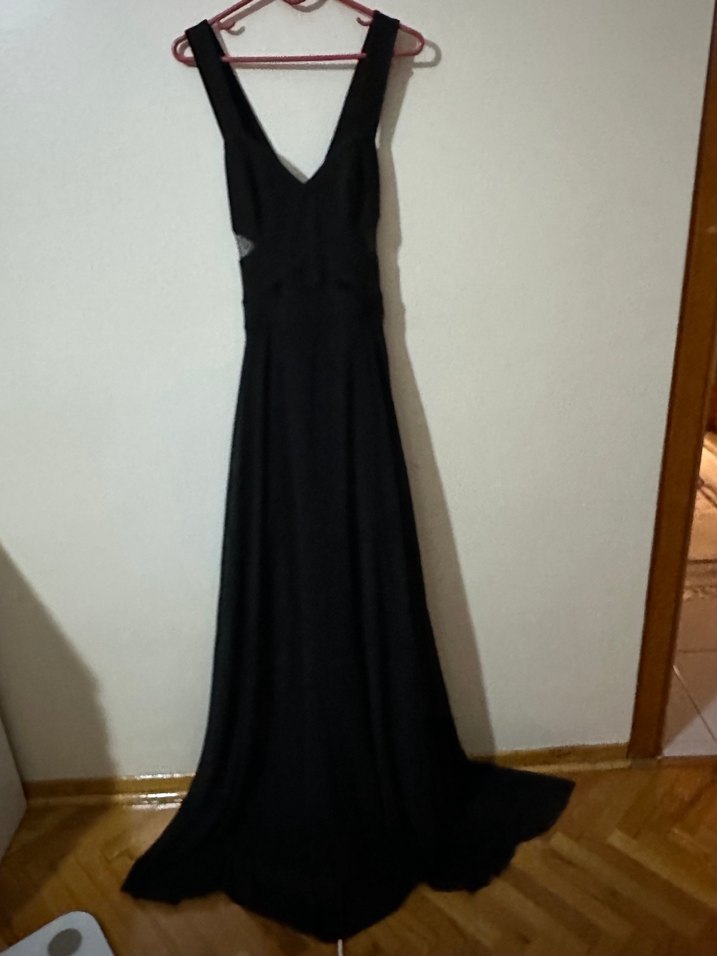 Siyah, uzun, askılı abiye elbise Yanlar ve göbek kısmı transparan İki koltukaltı arası:42 cm, uzunluk ( koltukaltından etek ucuna): 153 cm