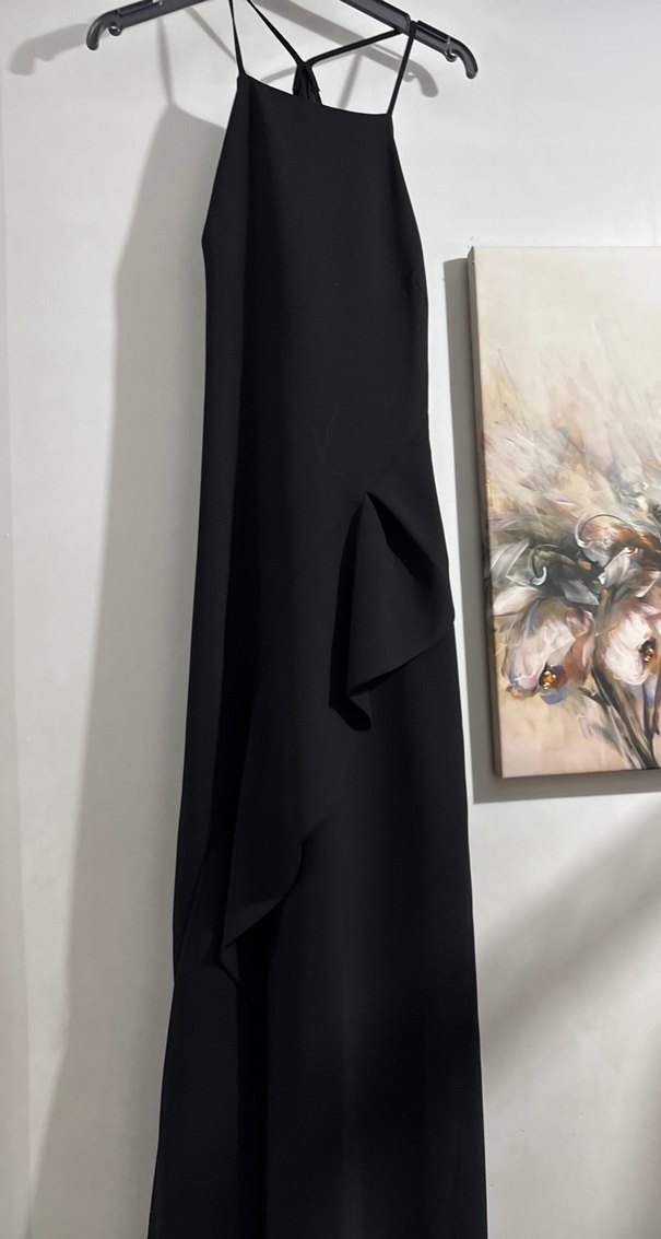 Siyah uzun elbise, kolsuz tasarıma sahip, sırt dekoltelive önden yırtmaçlı abiye elbise.Orijinal ipekyol