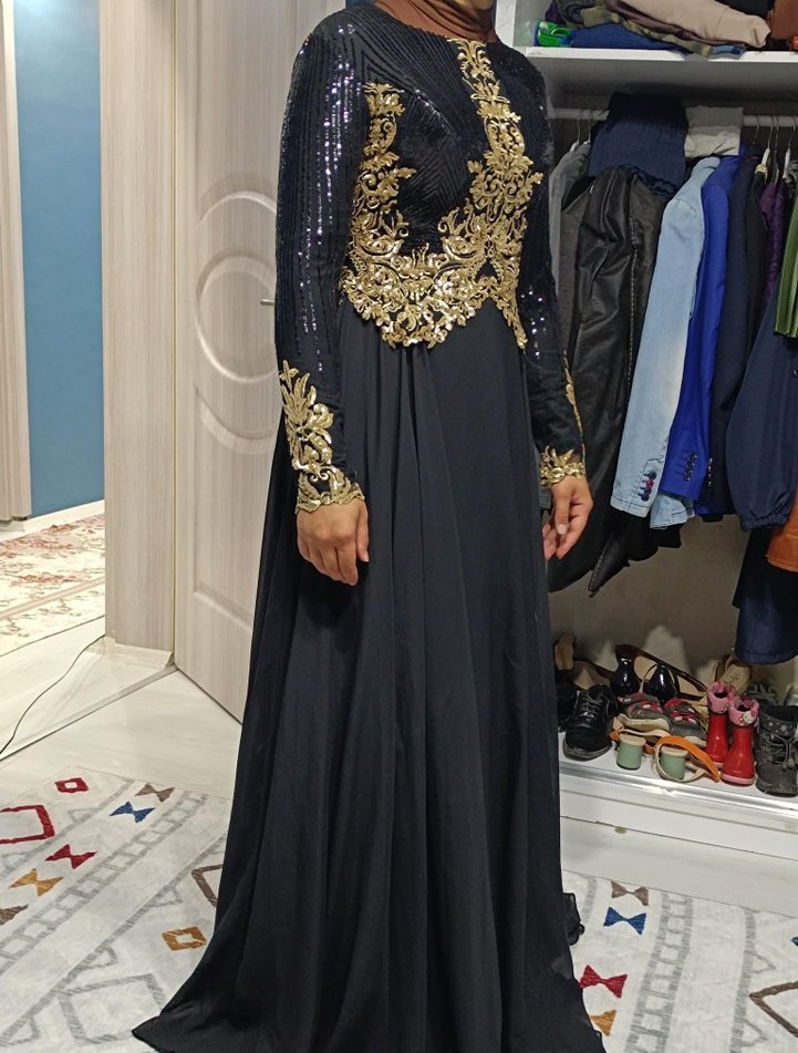 Yüksek yakalı, uzun kollu, drapeli ve desenli altın işlemeli siyah uzun abiye elbise, klasik zarafeti yansıtır. ✨bir kere tek giyildi
