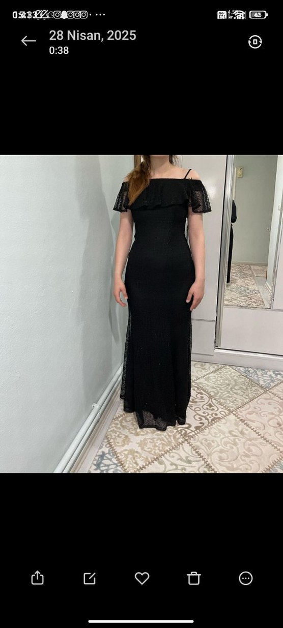 Siyah, uzun ve vücuda oturan bu abiye elbise, kayık yaka sahiptir. Ufak ip detayları dışında herhangi bir kusuru yoktur✨ Mezuniyet düğün için cok rahat ve şık bir seçenek