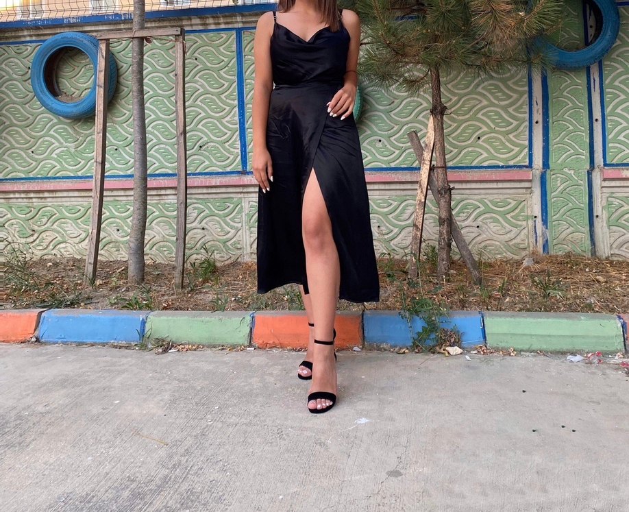 Siyah uzun elbise, askılı ve straplez yakaya sahip, ipeksi kumaştan yapılmış. Drapeli tasarım ve yan yırtmaç detayları bulunur.