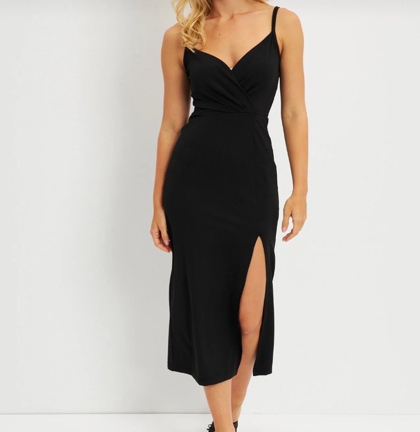 Siyah renkte, askılı ve V yakalı uzun abiye elbise. Drapeli detay ve bacak dekoltesi ile fit kesim, romantik akşamlar için ideal. Minimalist gotik tarzda cesur bir model.