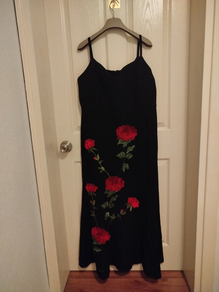 Siyah uzun elbise, askılı ince kayışlarla ve kırmızı güllerle nakışlıdır. İpek gibi kumaştan, bol kesim ve drapeli tasarıma sahiptir.