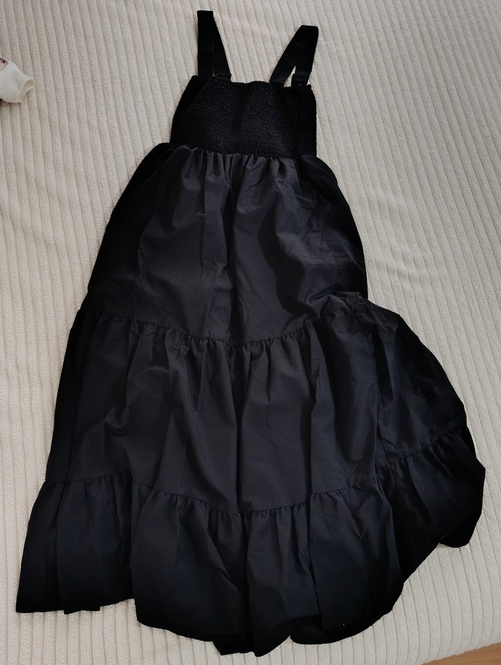 Siyah renkli, yüksek yakalı ve fırfırlı katmanlara sahip uzun elbise. Sentetik kumaştan, askılı ve bol kesim gotik tarzda.