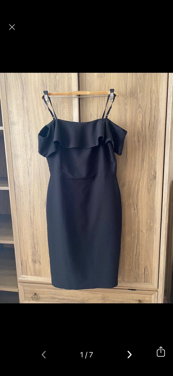 Siyah, askılı ve straplez yaka detaylı, fırfırlı uzun boy kadın elbisesi. Minimalist ve gotik tarzıyla ofis kullanımı için uygundur.