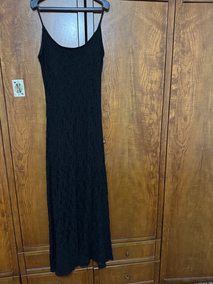 Siyah, askısız uzun elbise, dökümlü ve vücuda oturan kesimle, ipeksi kumaştan yapılmıştır. Gotik ve klasik şıklığı yansıtır.
