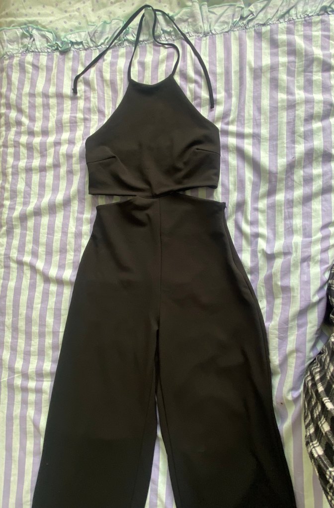 Siyah, uzun ve vücuda oturan tulum, yüksek yaka ve askılı detaylarla, sokak modası ve athleisure tarzını birleştirir.