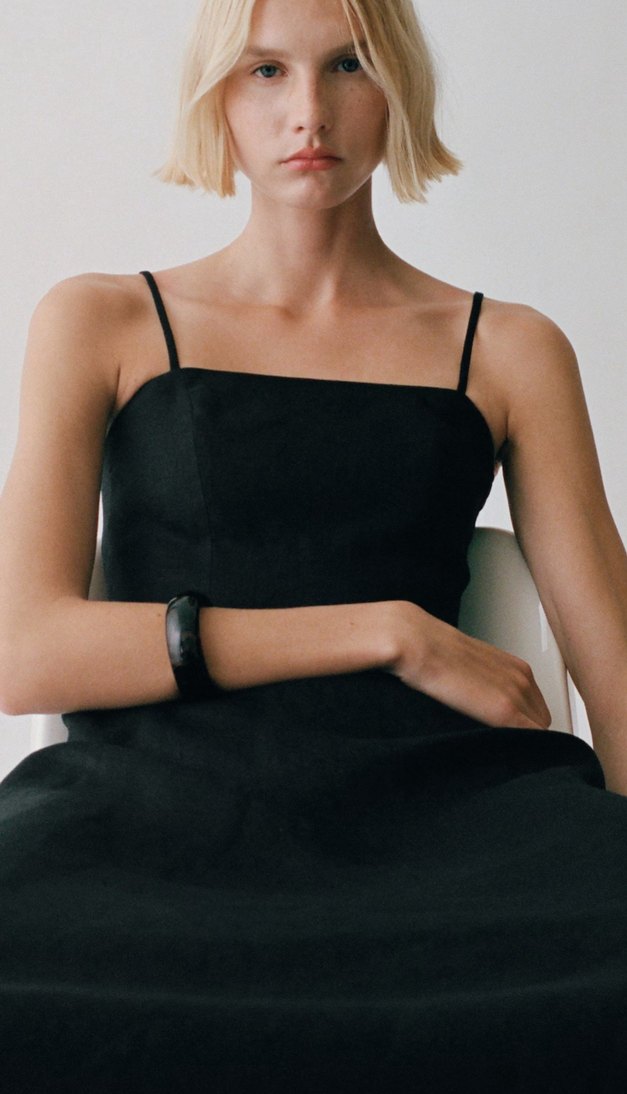 Uzun siyah elbise, ince askılar ve kemer ile tasarlanmıştır. Straplez yakaya ve rahat kesime sahiptir. Ofis için uygundur.