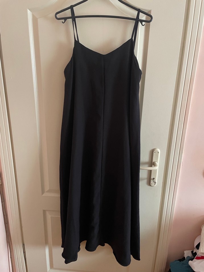 Siyah uzun elbise, salaş kesim ve ipeksi dokuyla drapeli tasarıma sahiptir. V yaka ve ince askılıdır, minimal ve şık bir görünüm sunar.