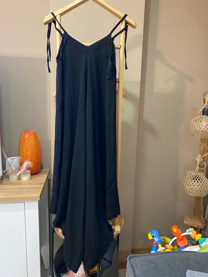 Siyah uzun, askılı ve salaş kesim elbise tulum, askı kısımlarında hafif sökükler var dikilebilir