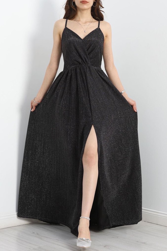 Siyah Uzun Askılı V Yaka Simli Abiye Elbise