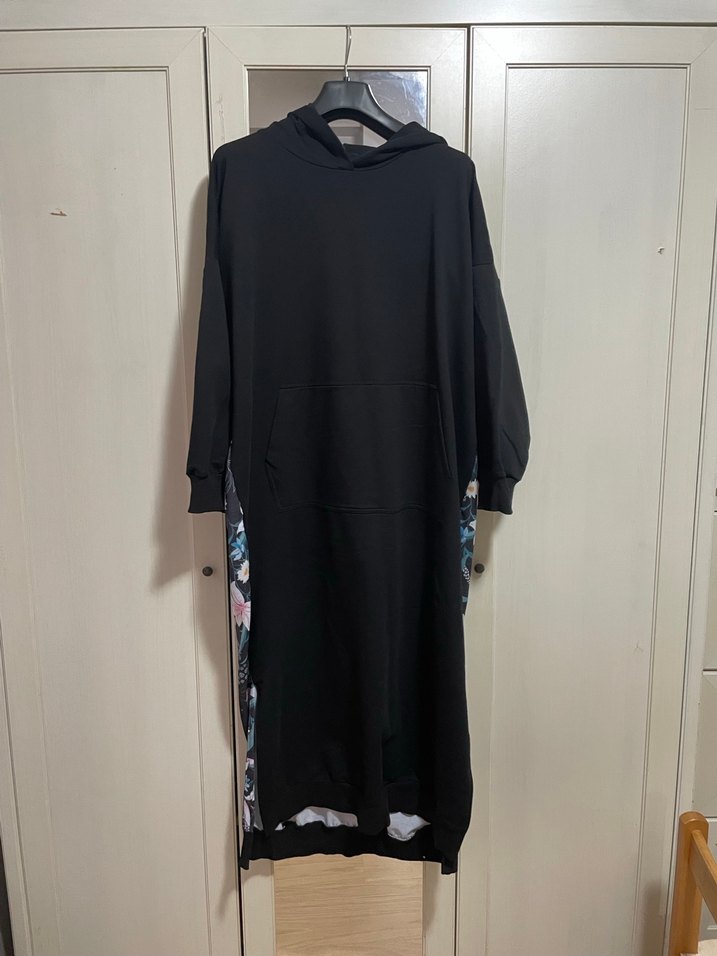 Siyah uzun elbise, bol kesim, uzun kollu ve yüksek yakalıdır. Cep ve şapka detaylar bulunur, günlük kullanım için uygundur.