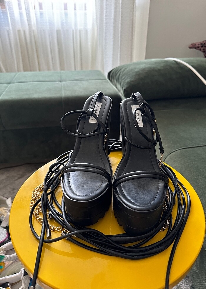 Ürün hiç kullanılmamıştır. Ürün bacak boyunca bağlanabilir uzun bir bağcığı vardır.Yüksek topukludur.