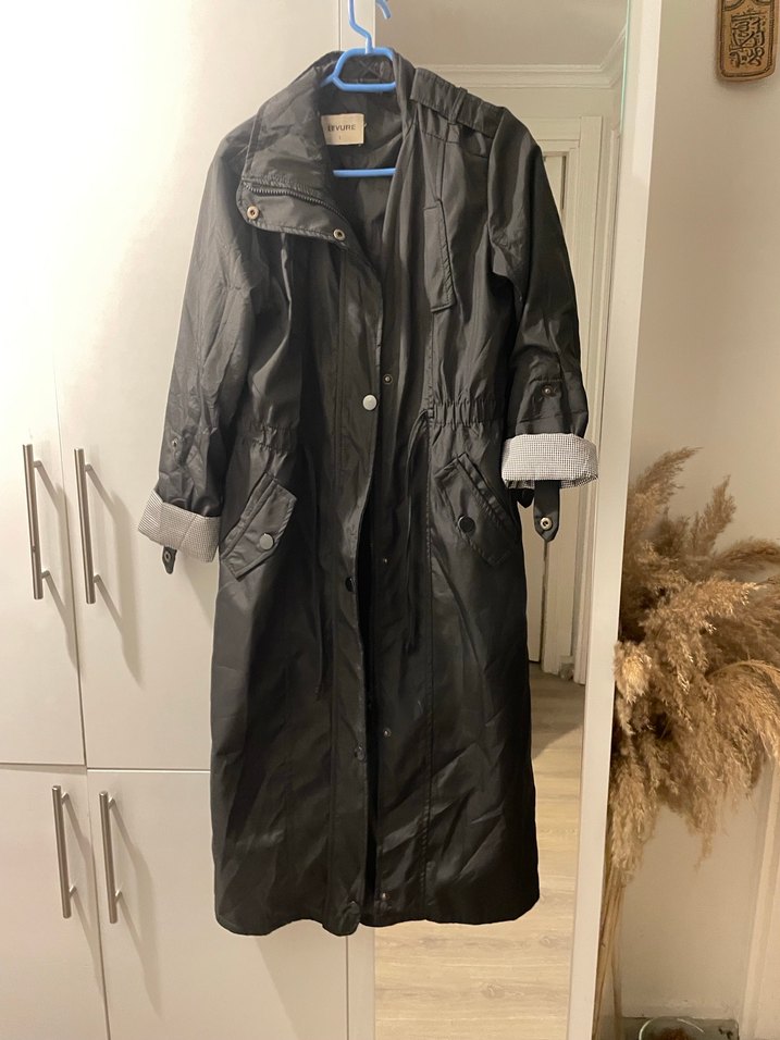 Siyah duzun boylu, beli kemerli, geniş kesim, uzun kollu, yakalı kadın yağmurluğu.
