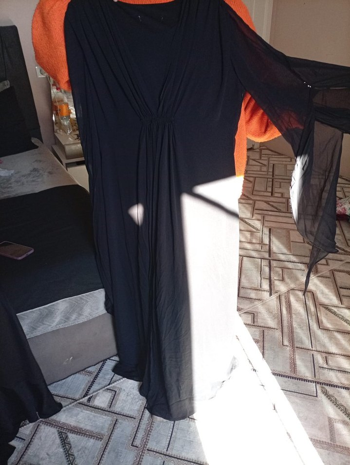 Uzun siyah elbise, dökümlü ve bol kesimli, uzun kollu detaylıdır. Sentetik kumaştan yapılmış gotik tarzdadır ve düğün için uygundur