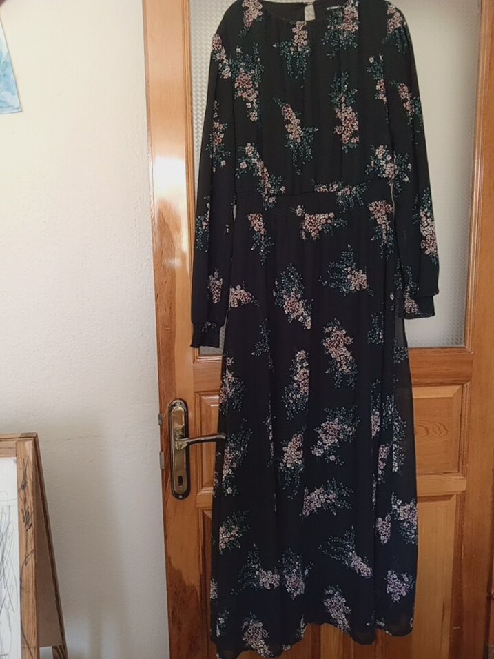 Siyah uzun kadın elbisesi, bol kesim, uzun kollu ve yakası kesik detaylıdır. Drapeli ve batik desenlidir, yumuşak sentetik kumaştan yapılmıştır, bohem tarzı için uygundur.