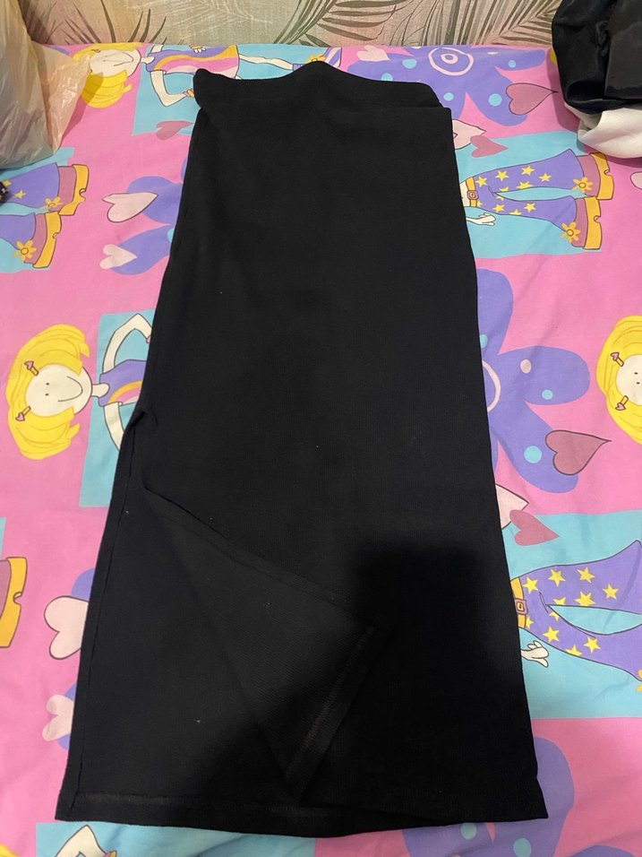 Siyah uzun, dar kesim etek yırtmaçlıdır ve yumuşak sentetik kumaştan yapılmıştır, günlük ve athleisure tarzlara uygundur.