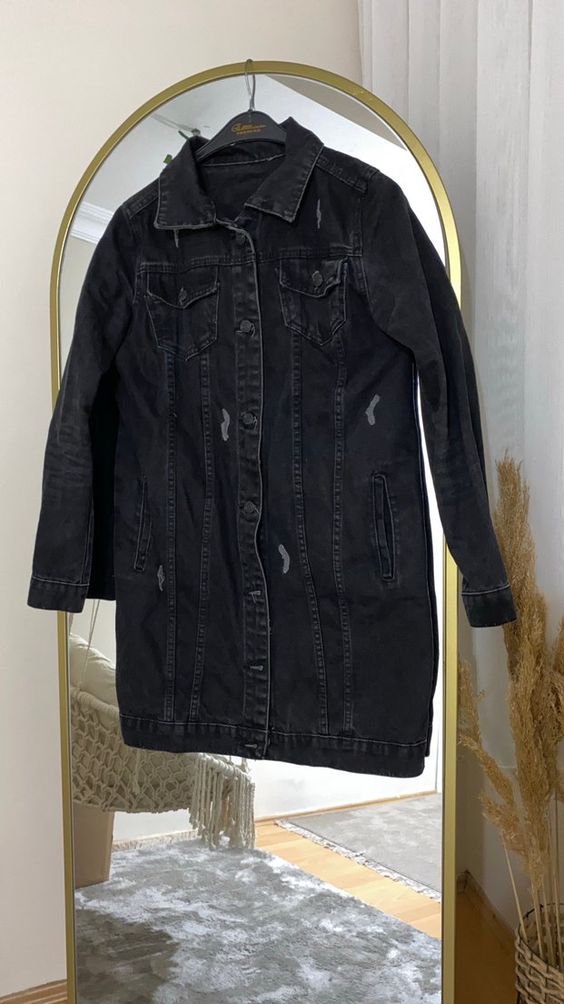 Siyah uzun kesim, düğmeli denim ceket. Geniş kesim, kesik yaka ve uzun kolludur, günlük sokak tarzı için uygundur.