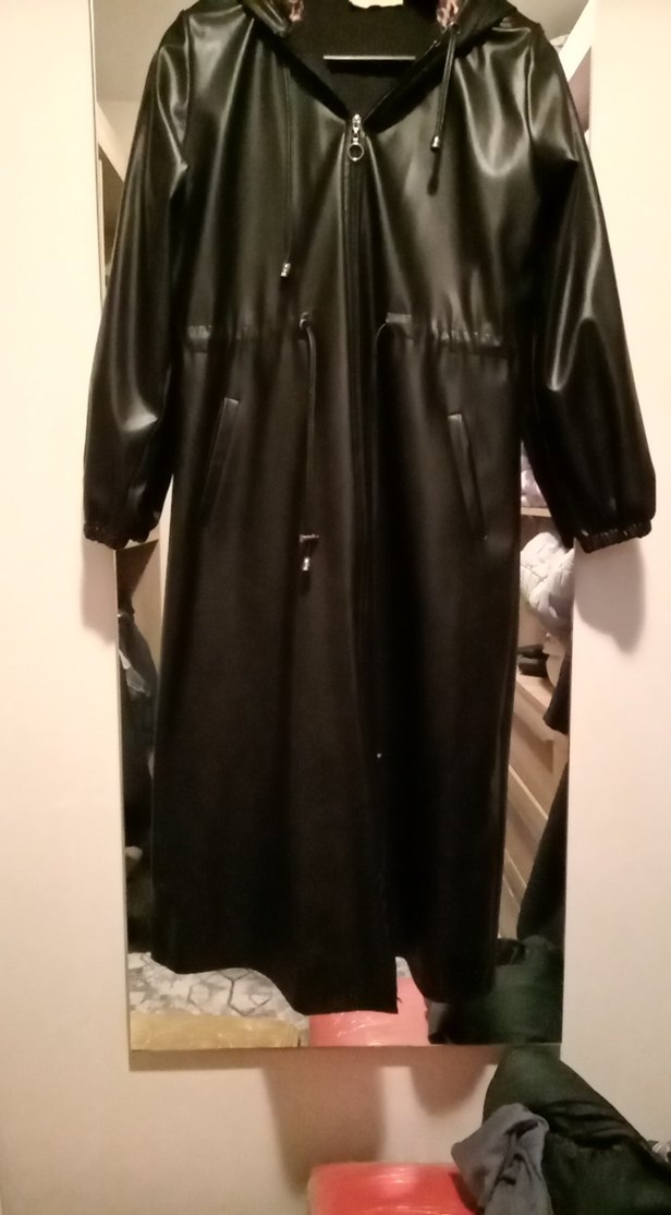 Siyah uzun deri yağmurluk, bol kesim ve kesik yakalıdır. Uzun kollu ve fermuarlı önüyle gotik stile uygundur.
