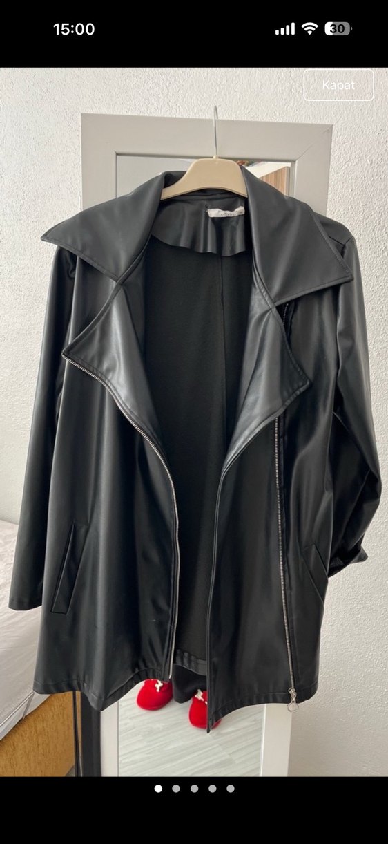 Siyah uzun deri ceket, drapeli ve kesik yaka ile dikkat çeker. Salaş kesim ve uzun kolludur, gotik tarz için uygundur.