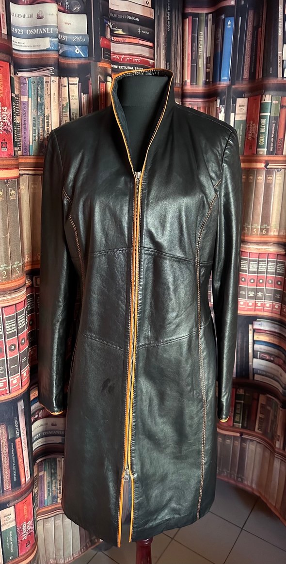Siyah uzun deri ceket, kesik yakalı ve fermuarlı. Regular kesim, uzun kollu, ofis ve sokak stili için uygun. ÖZEL OLARAK DİKTİRİLMİŞTİR..Fermuar sağlam sadece ucu kopuk fotoları inceleyin lütfen diğer ayrıntılar için, En 50 cm Boy 96 cm Kol boyu 62 cm