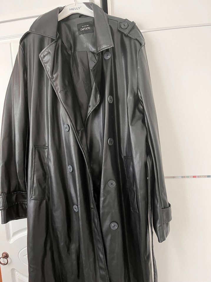 Siyah uzun deri kadın ceket, düğmeli ön ve kesik yakalıdır. Salaş kesim ve askılı kollarıyla trend günlük tarzı sunar.