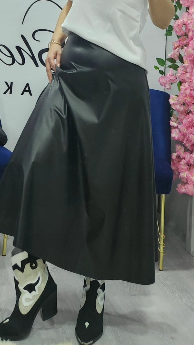 Siyah, uzun boy kadın eteği, bol kesimi ile deri kumaştan, sokak stili için uygun. Beden sorunuz...