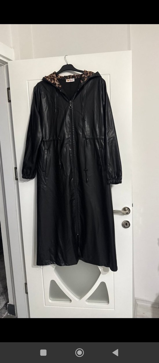Siyah deri uzun kadın kaban, bol kesim, uzun kollu ve yaka detaylıdır. detaylı kapüşonlu, sokak stili ve günlük kullanım için uygundur. bir kez giyildi bedeni küçük geldiği için satıyorum