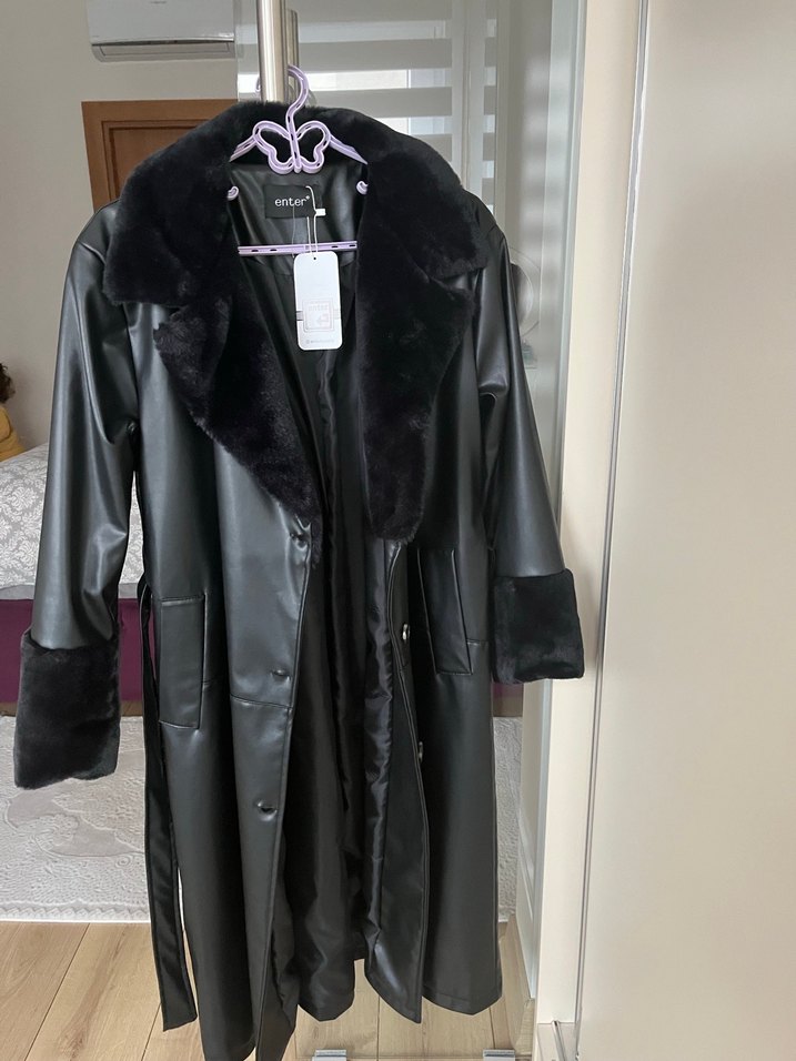 Siyah uzun deri kaban, kürk detaylı yaka ve manşetlerle, keskin yaka ve uzun kollu, Paris tarzı gotik şıklık için uygun.