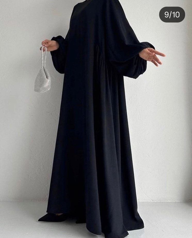 Bu uzun siyah elbise, dökümlü ve bol kesim olup yüksek yakalı ve askılı kolludur. kumaştan yapılmış, günlük kullanıma uygun mütevazı gotik tarz sunar.