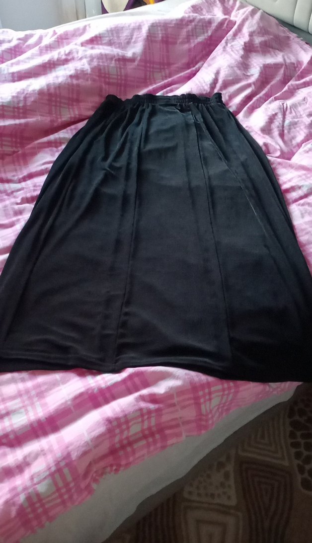 Siyah uzun etek, dökümlü ve bol kesim, ipeksi kumaştan, günlük kullanıma uygun gotik tarzda.