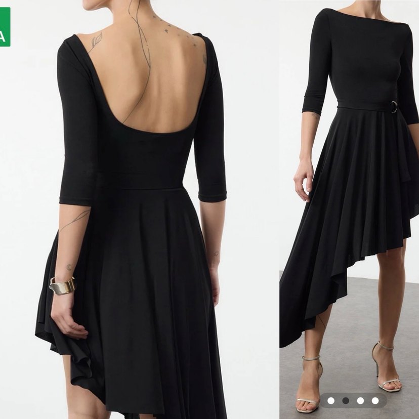 Siyah, ince kesim ve ipeksi kumaştan, kayık yaka ve drapeli detaylara sahip uzun elbise. Parti için modern ve avangard tarzda.