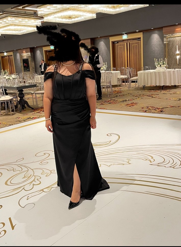 İç etiketi 48 ama 46-48 arası olur siyah, vücuda oturan uzun abiye elbise, kayık yaka ve askılı kollara sahiptir. Drapeli tasarımı ve yırtmaçı ile gotik tarzda düğünler için uygundur. 160 boy 83 kg ile giyildi 6 cm topuk ile