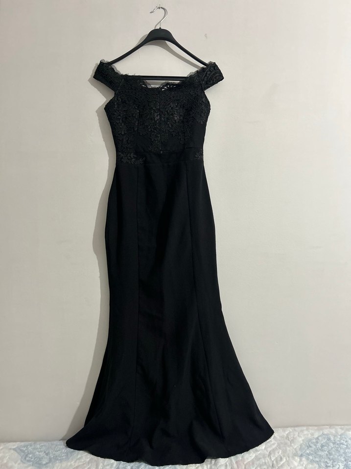 Siyah, drapeli ve dantelli uzun abiye elbise, kayık yaka. Bedeni tam sarıyor