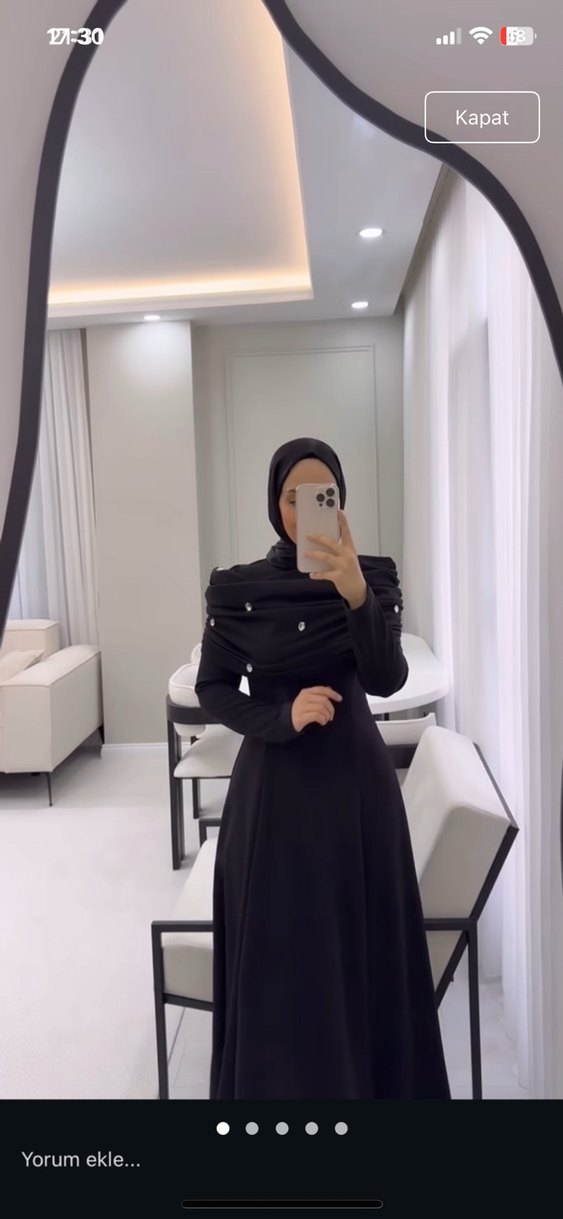 Siyah, uzun kollu, yüksek yakalı ve drapeli tasarıma sahip elbise . İpeksi kumaştan, rahat kesimli ve sade bir tarz sunar.