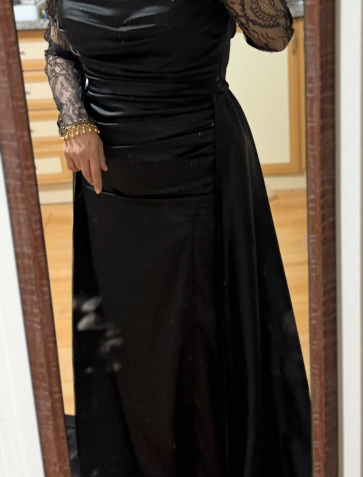 Drapeli ve uzun dantel kollu, tekneden yaka siyah, vücuda oturan bu uzun abiye elbise, klasik zarafeti gotik tarzla buluşturur.